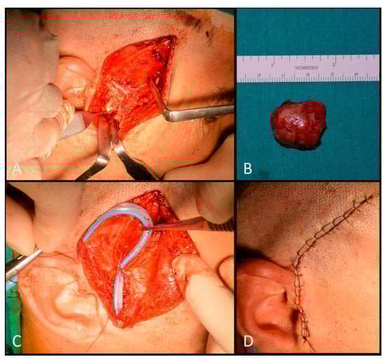 Intra-operatory view: Al-Kayat and Bramley preauricolar approach and TMJ exposure (A); condyle removal (B); Penrose drain positioning (C); and wound closure with running interlocking suture (D).