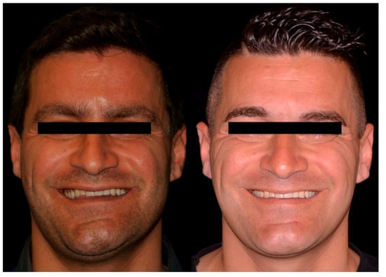 As soon as the patient refrained from the protocol proposed, the authors had to offer an alternative treatment that aimed to restore facial aesthetic and correct dental occlusion, respecting the patient’s will not to perform bimaxillary orthognatic surgery as recommended by standard treatment guidelines. This setback is usually linked due to side effects risks perception by the patient and lack of severity of functional chewing problem that could be managed with conservative treatments [,]. Hence, the surgical approach was limited to a right condylectomy and orthodontic treatment protocol had to be adjusted accordingly. The protocol proposal was based on the concept of decompensation used regularly for orthognatic surgery orthodontic treatment. Dentoalveolar compensation is a physiological phenomenon that occurs in most of severe occlusal discrepancies, capable of achieve normal inter-arch relationship []. Pre-surgical orthodontics in orthognatic surgery is required to contrast the physiological compensation, hence the definition as “decompensation”. Decompensation usually accentuates the patient’s malocclusion nonetheless allowing the surgeon to properly perform the bone segments movement and restore a normocclusion. In our case, we applied intrusive forces on sector 1 using elastic bands placed between two previously installed mini-screws. This procedure increased the inter-arch gap between sector 1 and sector 4, incrementing the right lateral open bite, but allowing a longer than usual upper translation of the frontal mandibular plane and the mandibular angle during the condylectomy. The right caudal occlusal plane canting was also orthodontically corrected, since surgically impacting the upper jaw on the right side was not an available choice. The intrusion movement was planned as 3 mm long during the pre-surgical stage. CAD/CAM software has been used in our case to plan the intrusion and the mandibular shift therefore guiding the condylectomy. The digital planning of all the operative phases allowed operators to perform a precise and minimally invasive treatment. The virtual pre-operative visualization of the area of interest should always start from a 3D Cone Beam Computed Tomography (CBCT) reconstruction. [] From the elaboration of the DICOM files obtained, a CAD software along with a CAM device transform the surgical planning into a 3D printed guides, resulting into a more precise and predictable surgery. This versatile technology allows a multidisciplinary team to manufacture surgical splints, osteotomy cutting guides, and plate-bending templates via 3D printing that can be used for cranio-maxillofacial reconstructions, temporomandibular joint (TMJ) reconstructions, traumas, and oncological reconstructions. Correct mandibular kinetic was restored thanks to early physiotherapy treatment. While the chosen approach allowed us to reduce hospitalization time and reduce early post-operative distress common during bimaxillary orthognatic surgery due to edema and oral wounds, some limitations can be observed. Standard orthognatic surgery could have avoided possible further touch-ups for chin and mandibular lower margin recontouring. The patient in fact, lost weight over time, resulting in a sharper mandible profile that underlined the persisting small asymmetry of the chin in frontal view. Nonetheless, the result was aesthetically reasonable for the patient and coherent with his will of refusing additional surgeries. Relapse of the occlusal condition is unlikely to be expected since the growth activity of this hyperplasic mandible was assessed pre-operatively through bone scintigraphy that showed no hypermetabolic areas.