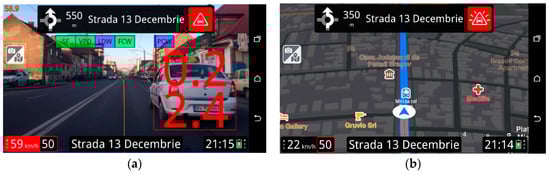 (a) Screenshot from the advanced driver assistance system (ADAS) application—default user interface using augmented reality; (b) Screenshot from the ADAS application—global positioning system (GPS) navigation user interface.