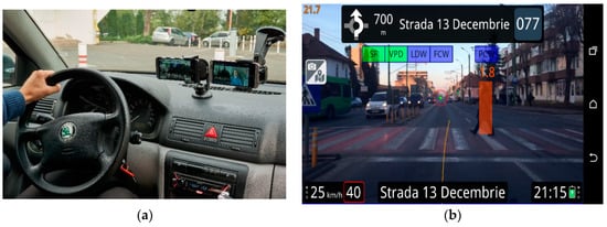 (a) The setup for the experiment, with the two smartphones positioned horizontally (one with the ADAS, the second for experiment video recording); (b) Screenshot from the ADAS application—pedestrian detected.