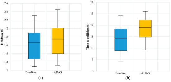 (a) Headway boxplots; (b) Time to collision boxplots.