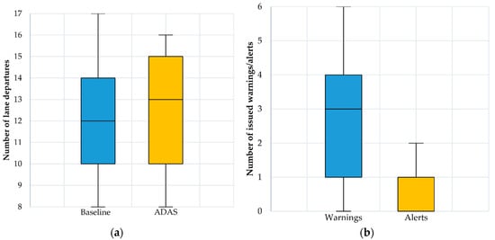 (a) Number of lane departures boxplots; (b) Numbers of warnings and alerts obtained during the ADAS scenario.