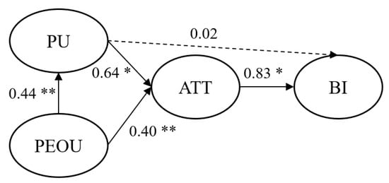 Model 3 with BI as the dependent variable aims to evaluate the impact of two independent variables, namely PU and ATT (H3, H5) over BI. The results are numerically presented in Table 2, Table 3 and Table 4 and as structural links of the proposed model in Figure 5.