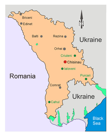 - Anonymous. Soil Map of Moldavskoi SSR (Moldava), Joint Research Centre, European Soil Data Center, (ESDAC). 2020. Available online: https://esdac.jrc.ec.europa.eu/images/Eudasm/MD/russ_x80.jpg (accessed on 10 September 2020). (In Russian).