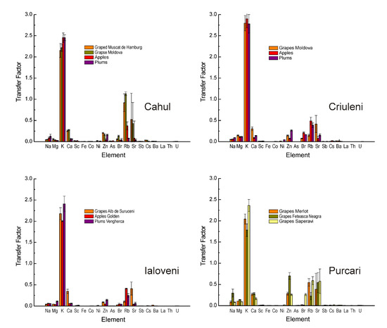- Zinicovscaia, I.; Sturza, R.; Gurmeza, I.; Vergel, K.; Gundorina, S.; Duca, G. Metal bioaccumulation in the soil–leaf–fruit system determined by neutron activation analysis. J. Food Meas. Charact. 2019, 13, 592–601. [Google Scholar] [CrossRef]