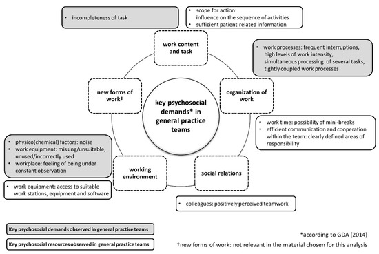General practices in Germany provide a variety of therapeutic and preventive health care services and procedures, including medical check-ups, vaccinations, laboratory testing, and disease management programs. They are established microenterprises, and the general practitioners (GPs) as employers are required by law to provide measures ensuring decent working conditions (see Article 153 of the Lisbon Treaty, [1]). This includes, among other things, the prevention of work-related psychosocial risks comprising demands such as poor work organization or a hazardous working environment, and the promotion of work-related resources [2,3]. General practices are not only confronted with healthcare specific challenges but also with aspects similar to other smaller and larger businesses. This includes, for example, limited financial and human resources to develop strategies for the prevention or mitigation of work-related stress [4], a highly regulated working environment [5,6], as well as financial competition from other practices and new emerging business models (e.g., medical care centers), or increasing difficulties to find successors willing to pursue a career within a complex and demanding working environment [7,8,9]. This study aims at gaining an in-depth understanding of work-related psychosocial demands and resources in general practices as an example for small enterprises.