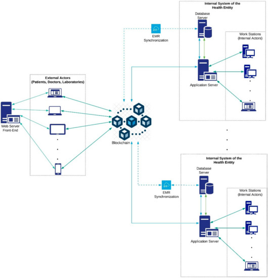 Figure 2 presents a general usage scenario for the proposed HealthyBlock architecture. In this graphic representation, the essential elements of implementation of the architecture can be seen, such as medical blockchain, responsible for storing the EMR, and health entities, which have database servers and applications that synchronize with the blockchain for the local storage of the EMRs. As it can be seen, the internal actors of these health entities such as doctors, nurses, and other authorized personnel communicate with the system through the internal application server. Likewise, the synchronizer component is in charge of keeping the medical records of the local databases of health entities unified with those of the blockchain, guaranteeing data integrity and resilience in the case of connectivity failures. Finally, there are external actors, such as patients, laboratories, and external doctors who communicate with the blockchain through an external web server. HealthyBlock is based on the following premises: