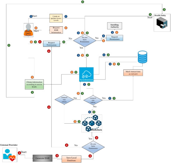 - Case 3. Attention to the patient in a health institution. This case begins when a patient attends a medical visit to a health provider, which may be their daily provider or a new one. There, the patient is cared for by the medical staff, who, if they have the appropriate permissions, and, according to approved clinical practices, start by consulting the patient’s medical records. For this, the synchronizer extracts the existing EMRs from the local data of the hospital and then proceeds to update them with those stored in the blockchain, as long as there is connectivity. In case of a connectivity failure, the system shows the latest update of the EMRs stored in the local database. Next, the medical staff performs the patient care and generates a series of medical records that are stored by the synchronizer: first, in the local database of the health provider, and then, if there is a connection to the network, it proceeds to send the transactions to the blockchain. If there is no connection, the synchronizer marks the new records as not sent and waist until there is a connection to send them to the blockchain, thus making them available for all the nodes of the system. In case of not having the required permissions, a request is made to the patient or the family doctor for access.