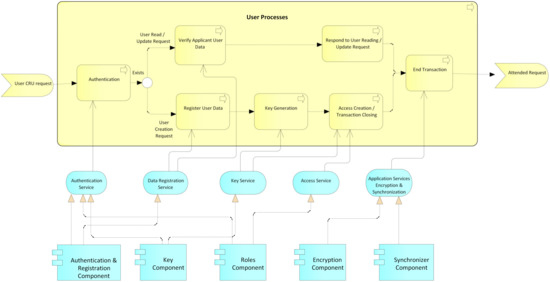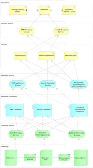 In this section, the design components and layers of the HealthyBlock architecture are presented. In order to show the relationships between layers and components, a layered viewpoint, using the ArchiMate® 3.1 (The Open Group, San Francisco, CA, USA) specification, was developed, as shown in Figure 4. The design serves as a guide to develop blockchain-based, unfragmented electronic medical record systems with data integrity, usability, security, privacy, and resilience characteristics in connectivity failure scenarios. As can be seen, the HealthyBlock architecture is made up of the following layers: technology, technology services, application components, application services, processes, processes services, and presentation.