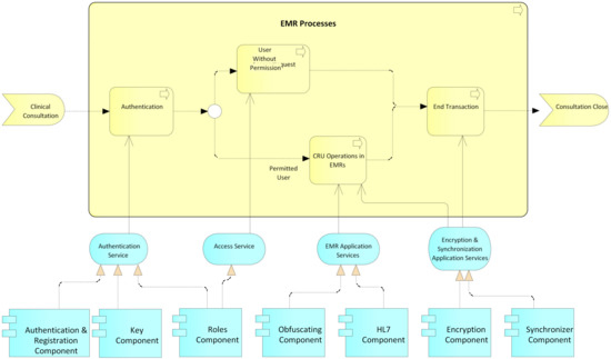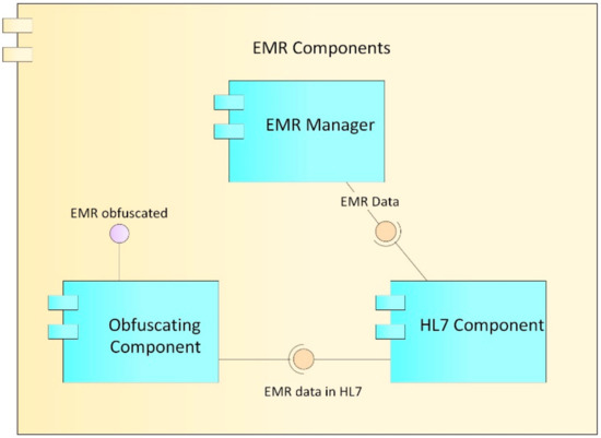 The EMR component (Figure 5) is made up of the EMR manager, HL7, and obfuscation components, which together provide the functionalities for the record management.