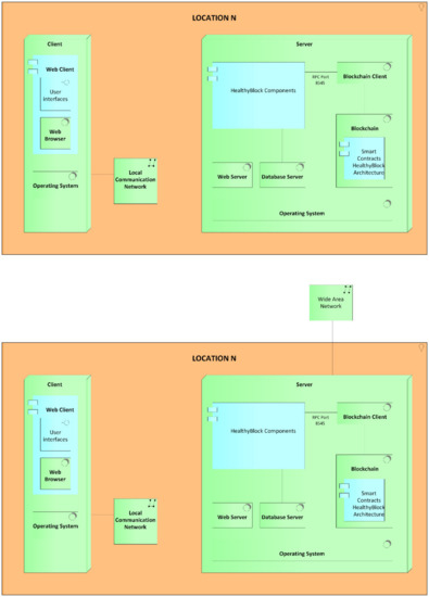 - Local database servers (hardware): these servers are configured with the operating system and the chosen database server (software) to store the clinical information of the patients locally. Hospitals may have their own information systems, but they must provide a two-way communication channel with the HealthyBlock system, which allows obtaining local data to be published on the blockchain and made available to all actors, and receiving patient data, which should be included in the patient’s local medical history.