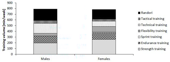 The distribution of the different training types across the entire season in young male and female judo athletes.