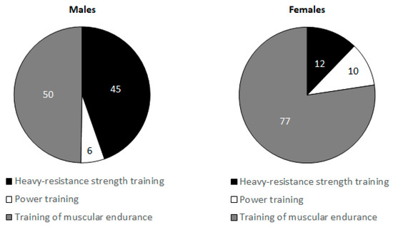 The distribution of the different strength training types across the entire season in young male and female judo athletes (in %).