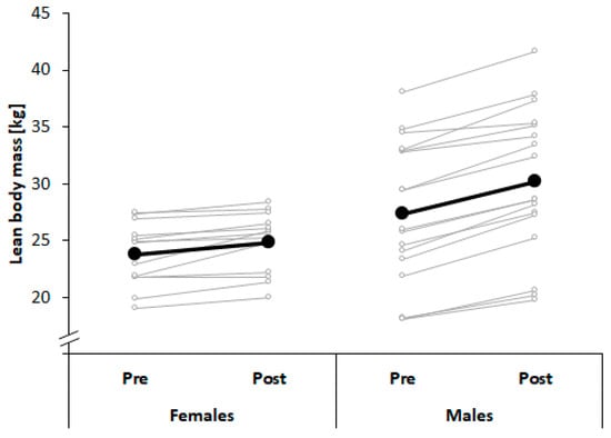 Table 1 illustrates changes in anthropometry and body composition over the course of the entire season. Our findings showed significant and large-sized time × sex interactions for lean body mass (p < 0.05; d = 1.3). Post-hoc analysis showed significant and larger gains in lean body mass in young male (p < 0.001; d = 6.0) compared with female judo athletes (p < 0.01; d = 2.4; Figure 3). Further, significant large-sized time effects were observed for body height (p < 0.001; d = 4.3) and body mass (p < 0.001; d = 1.9), with higher values at post-test compared with pre-test, irrespective of factor sex. Additionally, significant large-sized effects of factor sex indicated larger body heights (p < 0.001; d = 1.8) and body masses (p < 0.001; d = 1.3) and lower body fat values (p < 0.05; d = 1.0) in males compared with females, irrespective of time.