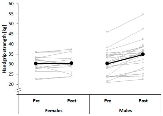 Table 2 illustrates changes in components of physical fitness after a season of judo training. Results showed significant and medium-to-large-sized time × sex interaction effects for isometric handgrip strength and CMJ height (p < 0.05; 0.7 ≤ d ≤ 1.6). Post-hoc analyses revealed significantly increased handgrip strength and CMJ height in males (p < 0.01; 1.9 ≤ d ≤ 2.8), whereas no changes were observed in females (p > 0.05; Figure 4 and Figure 5). Further, significant and large-sized time effects were found for the Y-balance test scores of the dominant and non-dominant limb with larger scores at post-test compared with pre-test (p < 0.01; 1.2 ≤ d ≤ 1.3), irrespective of sex. Moreover, significant and large-sized effects of factor sex were associated with larger DJ height and RSI in males compared with females (p < 0.05; 0.9 ≤ d ≤ 1.1), irrespective of time.