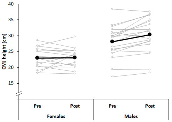 Changes in countermovement jump (CMJ) height across a period of 10 months of judo training in young male and female judo athletes.