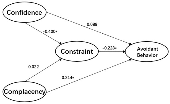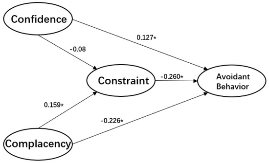 The estimations of conceptualized 3C-avoidant behavior model (China), * p < 0.05.