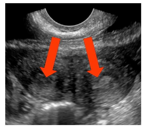 A 13-year-old patient reported to the Department with painful polymenorrhoea (menstruation twice a month, every two weeks) lasting 6 months. The first menstruation occurred in the 12th year of life (1.5 years before admission to the Department), menstruation was painful since menarche, with pain both before and after the period. The patient was initially diagnosed with a double uterus at a local hospital. In the past, the patient underwent diagnostics for congenital kidney agenesis. A renoscintigraphic examination showed agenesis of the right kidney with enlargement of the left one. A compensatory mechanism was considered as one of the potential causes of this enlargement. At the Department, the patient was subject to detailed diagnostics. The cervix was examined per vaginam from the left and posterior side. From the right side, an elastic mass, which corresponded to the residual vagina, was palpated. The ultrasound revealed a reservoir measuring 71 × 40 mm, with dense content, located inferiorly to the uterus. The examination also revealed two uteri with unenlarged cavities. Diagnostic laparoscopy was subsequently performed, during which the presence of a double uterus was confirmed; moreover, no macroscopic changes were found in the left and right appendages, but the Douglas pouch was bulging into the peritoneal cavity. Subsequently, the residual vagina was incised per vaginam, draining dark, thick blood. The hole was then widened and the hemivagina was resected. No perioperative or postoperative complications occurred. Antibiotic therapy (amoxicillin and clavulanic acid) and oral estrogen-progestin therapy also commenced. Subsequent hospital admissions took place during the following months to observe the outflow of menstrual blood. At that time, no blood retention was reported in the ultrasound. During the next two hospitalizations at the Department, subsequently one and two months after the incision of the residual vagina, the right vaginal outlet was expanded under general anesthesia. During the following hospitalizations, due to the preserved patency of the residual vagina, no further expansion or recanalization procedures were performed. No blood in the uterus is shown in Figure 1.