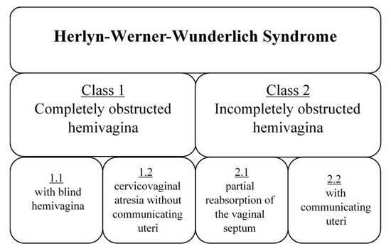 - Zhu, L.; Chen, N.; Tong, J.L.; Wang, W.; Zhang, L.; Lang, J.H. New classification of herlyn-werner-wunderlich syndrome. Chin. Med. J. 2015, 128, 222. [Google Scholar] [CrossRef] [PubMed]