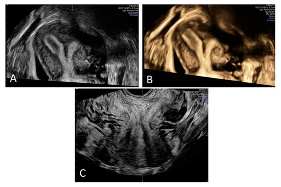 3D ultrasound of complete septate uterus. (A,B) Two uterine bodies divided by a septum; (C) Two uterine cervices.