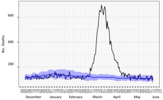 Figure 2 shows the mortality from all expected and observed causes in the community of Madrid (blue shading represents the average evolution of the previous 10 years). Various studies on the emotional impact of the coronavirus episode in the first days of confinement in Spain [6,7] explored the relationship between a comprehensive set of lifestyles, sociodemographic variables, and personality and mood variables during the early stages of quarantine. The presence of low tolerance to negative emotions, neuroticism, and, to a lesser extent, friendliness, sleep quality, the presence of children, and time spent surfing the Internet presented the strongest correlations with the population’s moods. A similar study was conducted in Portugal, in which the lifestyle habits, anxiety levels, and basic psychological needs (BPN) in Portuguese adults during the COVID-19 pandemic were characterized, including a comparison between sex and age groups [8]. Other studied parameters of interest include the population’s activity level and anxiety [9], and the relationship with addiction [10].