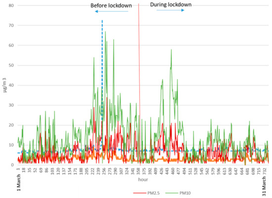 The measures implemented by the governments of different countries have caused numerous environmental impacts, some of which can be considered positive, such as the improvement in air and water quality in urban areas, whereas others have been negative, such as the deterioration of the quality of coastal effluents due to the elimination of sanitary supplies [11]. The improvement in air quality has been particularly notable in large cities in China, where outdoor pollution levels (NO2 and PM2.5) have decreased significantly during lockdown [12,13]. In European cities like Barcelona, NO2 concentrations were reduced by half during the lockdown, PM decreased lower, and O3 concentrations increased by around 50% [14]. PM2.5 deterioration of air quality may lead to various kinds of pulmonary and cardiovascular diseases causing premature death [15]. In addition, there are several studies that indicate cities with poorer outdoor air quality have had a higher death rate in those affected by COVID-19 [16,17,18,19,20].