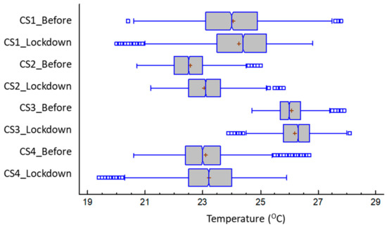 The temperature in the different case studies before and during the lockdown in Madrid.