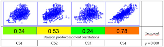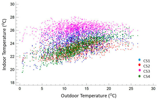 Although the dwellings had a heating system with a continuous operation (from 24/24 to 9 h a day), their control—when provided (CS 2 and 3)—and/or power sizing did not seem to provide a moderately stable environment, introducing significant oscillations and a thermal evolution linked to the external conditions, as shown in Figure 7. For verification, a correlation analysis was conducted by applying the Pearson product-moment (Figure 8), in this case between the exterior and interior temperature to evaluate the strength of the linear relationship between the variables. The p-value was used to verify the statistical significance of the estimated correlations (in this case, correlations significantly different from zero with a confidence level of 95.0% for all cases). CS3 had the weakest relationship, being closest to stable thermal control, with a value of the coefficient of 0.24. Conversely, dwelling CS4 was the most directly influenced by the evolution of the external temperature, with a value of the coefficient of 0.78 in the correlation. This behavior may have been associated with the highest permeability of the group (n50:8.2) with a somewhat high value in relation to the typical values [52] with a higher outdoor air infiltration rate.
