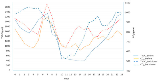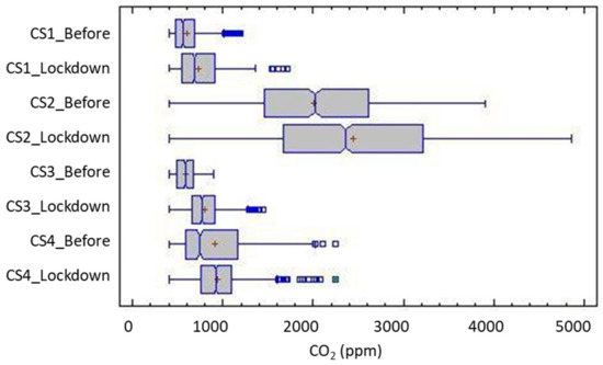As complementary information, the tropospheric urban ozone levels were low to very low, for both periods, mostly due to the climatological conditions. An average 8-h mean of 41 µg/m3 prior to the confinement and 57 µg/m3 in the lockdown time were measured, figures that are below the target value for the protection of human health (120 µg/m3, eight-hour average) as in DIRECTIVE 2008/50/EC [58]. The atmosphere situation with regard to the ozone concentration allowed for the very good or good classification (0–80/81–121 µg/m3 hourly mean) using the Air Quality Index of the city during both periods, prior and during confinement, with all the hourly means under the 100 µg/m3 figure and below the legal public information threshold (180 µg/m3 hourly). Therefore, for practical purposes and in terms of longitudinal analysis (before/after) given these values, we considered that the presence of tropospheric ozone was not very significant in the modification of the interior conditions of homes due to confinement. In the case of having occurred during the summer, we would expect these figures to be higher, given the city’s historical records.
