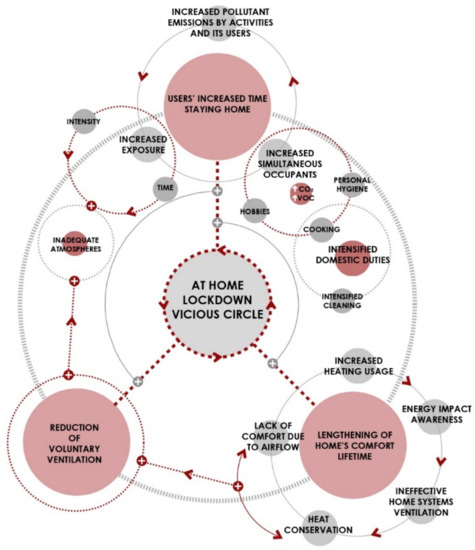 The reduction in environmental pollution in cities is a positive aspect for their inhabitants, which can contribute to improving living conditions during confinement by allowing for healthier ventilation. During this period, most of the population has been exclusively confined to their homes, so they were exposed to the same indoor atmosphere almost 100% of the time. In many cases, these homes are not entirely suitable for intensive use, with little interior space in relation to the number of inhabitants and, on many occasions, without adequate systems for thermal comfort, ventilation, and indoor air renewal [21,22,23].