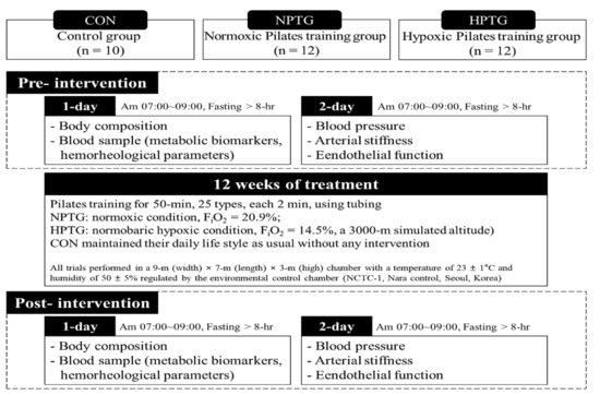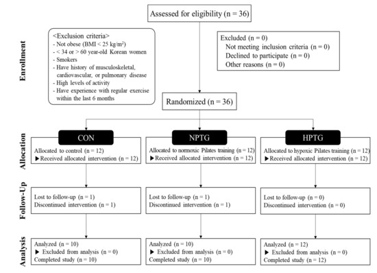 This study included 36 Korean women with obesity (age: 34–60 (47.5 ± 7.5) years) who were non-smokers and had no history of musculoskeletal, diabetes, cardiovascular, or pulmonary disease. All subjects fulfilling the following conditions were included: did not take any medication; had a body mass index (BMI) of >25; participated in only low levels of activity (no exercise performed over the last 6 months). All subjects received information regarding the purpose and process of this study and provided informed consent after receiving sufficient explanation regarding the experiment and possible adverse effects prior to the start of the study. Thereafter, they were randomly assigned into control (CON; n = 12), normoxic Pilates training (NPTG; n = 12), and hypoxic Pilates training groups (HPTG; n = 12) using a computerized random number generator. However, four subjects (CON: 2 and NPTG: 2) were excluded from the study owing to withdrawal (n = 2) and noncompliance (n = 2). The required sample size was estimated using an effect size (ES = 0.69) reported in the effect of exercise on flow-mediated dilation (FMD) of vascular endothelial function [10]. With an alpha of 0.05 and a desired power of 0.80, the total sample size necessary to achieve statistical significance was estimated to be 12 participants. The sample size calculation was performed using G*Power software (version 3.1.9.7, University of Kiel, Kiel, Germany). The consolidated standards of reporting trial (CONSORT: Consolidated Standards of Reporting Trials) flow diagram is shown in Figure 1 and characteristics of the subjects are presented in Table 1. The trial was reviewed and approved by the Institutional Review Board of the Konkuk University (7001355-201909-HR-334) and was conducted in accordance with the Declaration of Helsinki. The trial information is registered with the Clinical Research Information Service in Korea (KCT0004517).
