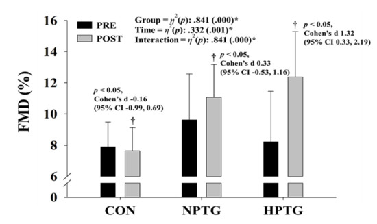 A significant interaction was found for FMD (p < 0.001, η2 = 0.841), which corresponds to vascular endothelial cell function (Figure 3). Post-hoc analyses revealed significant attenuation of FMD in the CON (Cohen’s d: −0.16, 95% CI: −0.99, 0.69, p < 0.05) and significant enhancement of FMD in the NPTG (Cohen’s d: 0.33, 95% CI: −0.53, 1.16, p < 0.05) and HPTG (Cohen’s d: 1.32, 95% CI: 0.33, 2.19, p < 0.05). However, a greater improvement in FMD was observed in the HPTG than in the NPTG (NPTG vs. HPTG: 15.6% vs. 51.2%).