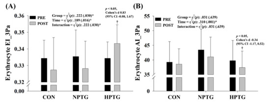 Figure 4 depicts the pre- and post-intervention erythrocyte EI and AI data corresponding to hemorheological function for all groups. A significant interaction was found for the erythrocyte EI_3 Pa (p < 0.030, η2 = 0.222). Additionally, a significant main effect within time was found for the AI_3 Pa (p < 0.001, η2 = 0.310). Post-hoc analyses revealed a significant improvement in the erythrocyte EI_3 Pa (Cohen’s d: 0.83, 95% CI: −0.08, 1.67, p < 0.05) and erythrocyte AI_3 Pa (Cohen’s d: −0.34, 95% CI: −1.17, 0.52, p < 0.05) in the HPTG.