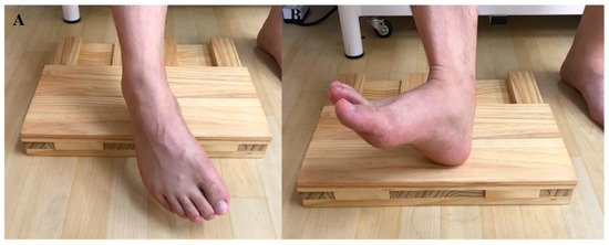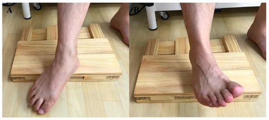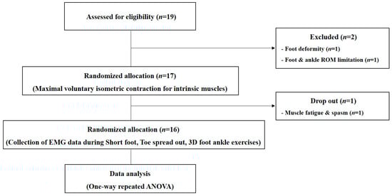 Nineteen participants were required for the present study design in order to achieve 80% power, a 0.25 effect size (η2), and an alpha level of 0.05. A total of 19 healthy male and female adults, who fully understood the purpose of the study and gave consent to participate in the study, were selected as participants. The inclusion criteria were as follows: no experience in foot–ankle exercises, no ankle injury and pain within the last 3 months, and aged between 20 and 30 years and residing in the local community. The participants who satisfied the following criteria but were excluded from the study either had a deformity or a disease in the foot, and were unable to perform the exercises, or had a neurological disorder, and had pain around the foot or the ankle. The descriptive statistics for the final selected participants are shown in Table 1. The entire study procedure was approved by the Catholic University of Pusan Institutional Review Board (CUPIRB-2020-017). The diagram of the study design is shown in Figure 1.