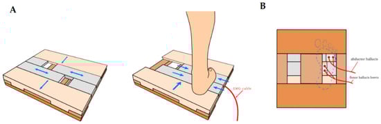 This study used a surface electromyogram (EMG; TeleMyo 2400T, Noraxon Inc., Scottsdale, AZ, USA) to measure the activity of the intrinsic foot muscles. The surface EMG was sampled at 1000 Hz and digitised using a 16-bit analogue to digital converter. Signals were filtered at a bandwidth of 20–400 Hz to eliminate any noise recorded during the data collection process, and a root-mean-square (RMS) window of 50 ms was used for signal smoothing. The mean of each period was calculated during the foot–ankle exercises. All electrodes were attached to the target muscles after cleaning the sites with alcohol to reduce skin impedance. To measure the activities of AbH, adductor hallucis (AdH), extensor hallucis longus (EHL), and flexor hallucis brevis (FHB), the surface electrodes were attached to the leg on the dominant side as described in a previous study [18]. For the AbH, an electrode is attached at the anterior margin of the medial malleolus, which is located in front of the imaginary line, approximately 1–2 cm posterior to the navicular tuberosity. For the AdH, it is attached at the most prominent part of the muscle belly, just proximal to the third metatarsophalangeal joint. For the EHL and FHB, the electrodes are attached at three finger widths above the bimalleolar line of the ankle, just lateral to the crest of the tibia and the most prominent muscle belly that is proximal and medial to the tendon of the flexor hallucis longus. The dominant leg was defined as the leg that is able to kick a ball farther [19]. To eliminate noise caused by floor contact, the AdH and FHB muscle activities were measured using the developed EMG plate in this study (Figure 2).
