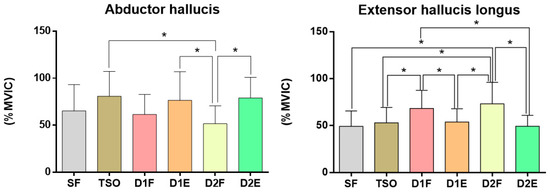 Comparison of the activation of abductor hallucis and extensor hallucis longus during foot–ankle exercises. * p < 0.05.