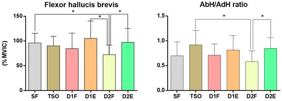 Comparison of the activation of flexor hallucis brevis and AbH/AdH ratio during foot–ankle exercises. * p < 0.05.