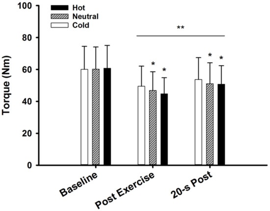 MVIC torque throughout testing (Baseline), MVIC at the end of the fatiguing task (Post Exercise), and 20 s post fatiguing task (20-s Post). * (p < 0.05) vs. cold. ** (p < 0.05) vs. baseline.