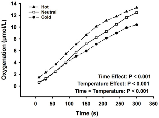 Prefrontal cortex oxygenation, as calculated as change from baseline values, throughout the fatiguing task. There was a main effect of time, temperature condition, and an interaction (p < 0.001). Data are displayed as mean values. Standard deviation bars were removed for clarity.