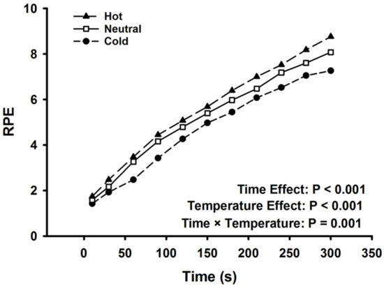 Ratings of perceived exertion throughout the fatiguing task. There was a main effect of time and temperature condition as well as an interaction (p < 0.001). Data are displayed as mean values. Standard deviation bars were removed for clarity.