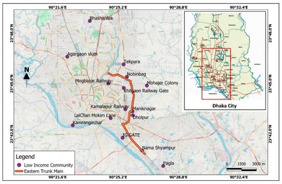 In urban Dhaka, the existing sewerage network serves only 20% of the total urban population, mostly concentrated in wealthier areas. A 2005 census identified 4966 slums in Dhaka city and found that almost all were without any sewerage network coverage. Dhaka’s current population density is the 6th highest in the world—29,069 people per km2 (2020) []. Over 35% of the city’s population (18 million) lives in Dhaka’s low-income settlements. Improved sanitation facilities are mostly found among middle and higher-income households []. A rapid increase in urbanisation with insufficient Faecal Sludge Management (FSM) services and inadequate investment in the sector are major barriers to pro-poor urban sanitation []. Additionally, low-income households usually refrain from investments in sanitation due to tenure insecurity []. Many residents in low-income settlements use simple pit latrines with/without water seals, septic tanks, cluster latrines, communal latrines, or hanging sanitation suspended over water bodies []. Faecal matter from pits and septic tanks spills over into open areas, and stormwater in over-flowing open drains becomes contaminated with untreated sewage. This poses significant health risks to the poor, who often live in low lying or unplanned settlements []. The Bangladesh Bureau of Statistics (BBS) identifies urban LICs to predominantly be characterised by poor housing, poor quality or no sewerage and drainage, inadequate drinking water supply, and few or no paved streets or paths [,]. Many LICs are also located near polluted water bodies, swamps, or putrid drainage canals []. The urban poor population in this country is being neglected in many ways in terms of social, economic, and infrastructural improvement [,,,]. Limited access to water and sanitation services in slums could contribute to the poor health of slum residents [].
