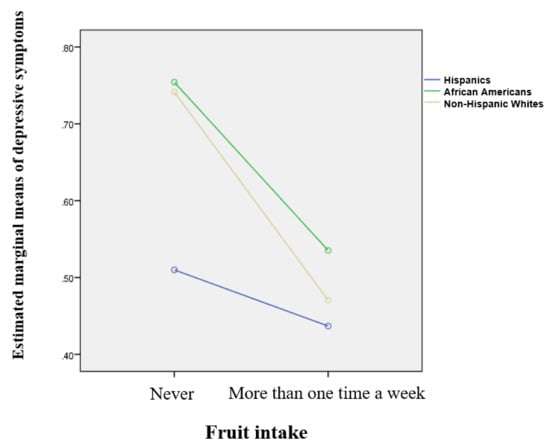 Table 4 showed that there was an association between health behaviors and mental health across young adult females. Model 1 reveals that Hispanic females were less likely to suffer from depressive symptoms compared to non-Hispanic White females (β = −0.08, p < 0.05). Older age was significantly associated with greater risks of depressive symptoms (β = 0.01, p < 0.001). Young adult females who were married, had achieved educational attainment, were employed, and earned more income were less likely to be depressed (β = −0.17, p < 0.001; β = −0.07, p < 0.05; β = −0.07, p < 0.05; β = −1.49, p < 0.05). As health behaviors were entered into model 2, Hispanic females still tended to be at a lower risk for depressive symptoms compared to non-Hispanic White females (β = −0.08, p < 0.05) and other demographics and socioeconomic status (SES) factors remained significant. Among health behaviors, fruit intake was significantly related to lower levels of depressive symptoms (β = −0.19, p < 0.001). As shown in model 3, interaction effects were found, indicating that Hispanics moderated the association between fruit intake and depressive symptoms (β = 0.28, p < 0.05). Figure 1 indicates the differences across racial/ethnic groups. All racial/ethnic groups demonstrated that levels of depressive symptoms decreased if they were to eat fruit more than one time a week compared to those who never did. However, the roles of fruit intake on depressive symptoms were slight in Hispanic females (0.51 vs. 0.44), while levels of depressive symptoms across non-Hispanic White females were greatly influenced by fruit intake (0.74 vs. 0.47).