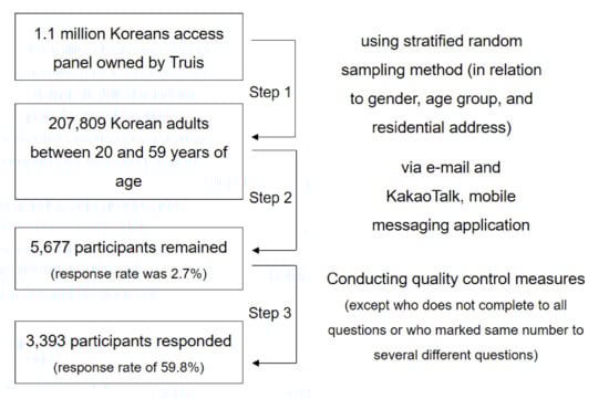 A market research company in Korea, Truis, has access to a panel of 1.1 million Koreans, and 207,809 Korean adults were selected by gender, age group and residential area using random sampling. They received an e-mail and a Kakao Talk message inviting them to participate in the survey. The initial response rate was 2.7%; 5677 responded to the survey. After conducting quality control measures (excluding those who did not complete all questions or who had marked the same number for several different questions), there were 3393 final participants, excluding respondents who did not complete the survey. All quality control of data for this survey was ensured by the Truis company. This process described above is shown as a diagram (Figure 2).
