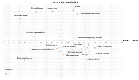 Factor analysis was performed to reduce the dimensions that affect the personal psychological characteristics for the risk perception of the 19 common risk factors into simpler dimensions, for the purpose of finding the possibility of summarizing eight psychological characteristic variables in two dimensions. In the factor analysis, factors were extracted using the principle component method and the varimax rotation method. Since the perception of risk factors differs according to individual experiences and psychological judgments, we analyzed people’s aspects of risk by using cognitive maps that express individual risk perceptions for each risk factor as an average. Based on P. Slovic’s psychometric paradigm model, a factor analysis was performed on the perception of risk factors for each source of electromagnetic fields, and a risk perception map was created (Figure 3). As a result of factor analysis by electromagnetic wave risk factors, eight variables were divided into two factors. Therefore, the contents extracted as factor 1 were subjective cognition, seriousness to future generation, dreadfulness, Resilience, Risk known to science, Immediacy of the effect of risk, Familiarity, etc., which are called Dread on the X axis, and factor 2 is uncontrollability, Y. Each hazard was marked by naming it uncontrollable. Dread means psychological fear of each risk factor, and uncontrollable means that the individual is an area in which it is difficult to control each risk factor.