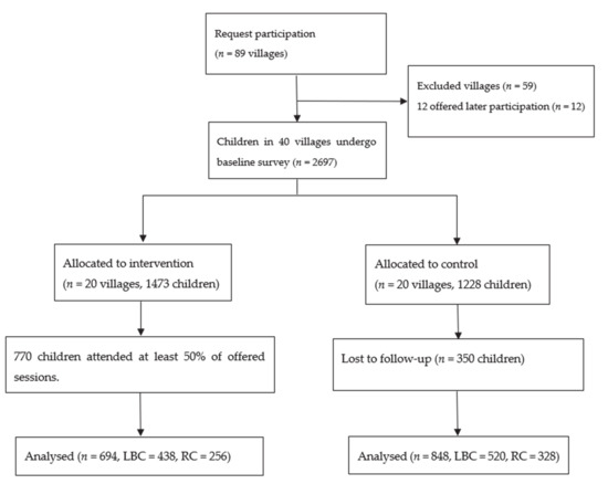 These are shown in Table 1. Around 90% of the children residents aged 7 to 15 completed questionnaires: 1473 in intervention villages, (including 55.7% LBC), and 1224 in control villages, (including 58.4% LBC). Children in intervention and control villages were well-matched in terms of socio-demographic and well-being characteristics at baseline.