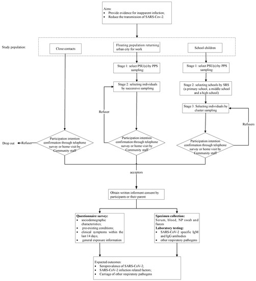 The study design is presented in Figure 1. Investigators will communicate with the selected participants or guardians in advance to assure their intention of participating this program. The refusers will be replaced by resampling without replacement in each PSU. Investigators will visit the eligible participants at the appointed time; obtain written informed consent; complete the questionnaire survey; and collect blood specimens, NP swabs, and annal swabs. Feces specimens are limited to diarrheal participants and will be self-collected with sterile containers. Investigators will take them in the next day.