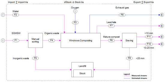 Material flow visualization was performed using STAN version 2.6 software developed at the Vienna University of Technology (Austria) [37]. STAN was also used to estimate the mass of gaseous releases during the composting process by mass-balance. These estimations were performed through the Equation (5).