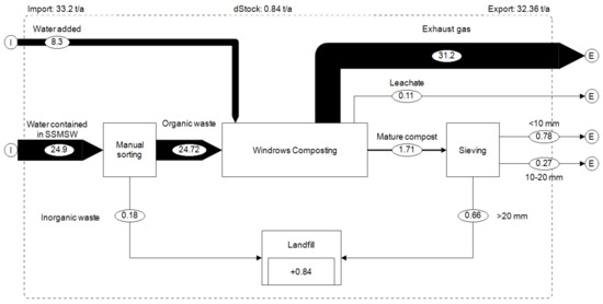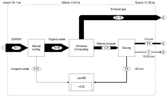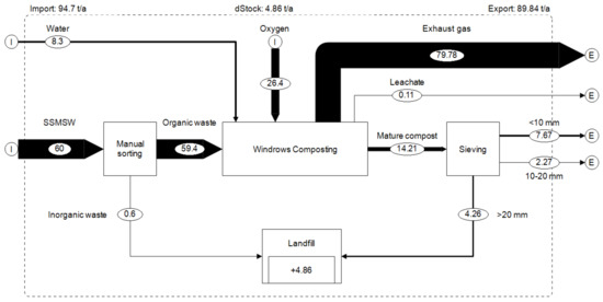 Material flow analysis is a systematic assessment of the flows of materials within a defined space and a certain time. This tool is based on the mass balance principle [20,21]. MFA is widely used in waste management field for environmental impact assessment of waste treatment plants as well as for plants performance and efficiency evaluation [22,23]. For example, Jensen et al. [24] performed a MFA to obtain the transfer coefficients for a combined dry anaerobic digestion and post-composting facility in Spain. Guo et al. [25] studied the material flow on dry weight basis of a food waste (FW) bioconversion plant using black soldier fly larvae (BSFL) in China. In addition, Padeyanda et al. [26] used MFA to assess the environmental impacts of the different management stages (collection and transportation, treatment, and material use) of food waste in South Korea.