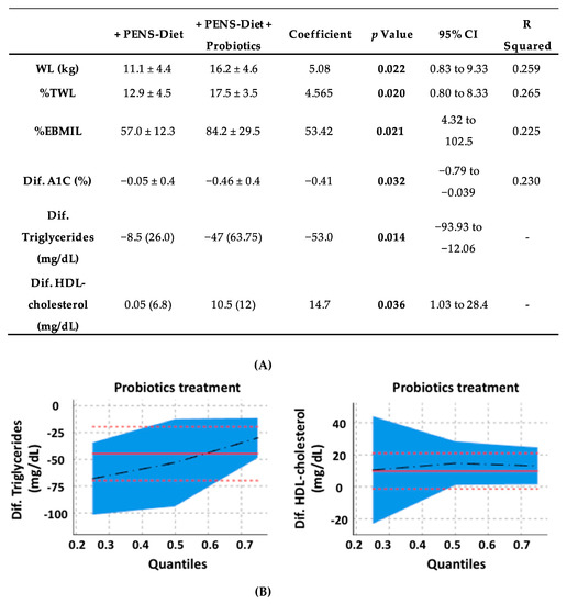 By further comparison between both therapeutic approaches (Table 4), PENS-Diet + probiotics unveiled a significantly higher weight loss (16.2 vs. 11.1 kg, respectively; p = 0.022) and total weight loss (%TWL) (17.5 vs. 12.9%, respectively; p = 0.02) than the PENS-Diet intervention. The excess BMI lost (%EBMIL) was also significantly higher (84.2 vs. 57.0%, respectively; p = 0.021) after probiotics. Moreover, plasma A1C, triglycerides and HDL-cholesterol levels were more reduced (−0.46 vs. −0.05 mg/dL, p = 0.032; −47.0 vs. −8.5 mg/dL, p = 0.002; and 10.5 vs. 0.05 mg/dL, p = 0.005, respectively) (Table 4). These data suggest that an administration of multistrain probiotics to a PENS therapy under hypocaloric diets could further decrease the body weight, glycemia, and dyslipidemia in obese patients. In this regard, we tested the potential associations between probiotics and the body weight parameters, A1C, and lipid levels. By univariate linear regression, probiotics administration was significantly associated with the difference of WL, %TWL, %EBMIL, and A1C. Similarly, by quantile regression, probiotics was associated with the difference of TG and HDL (Figure 1A). Indeed, probiotics showed a positive association with WL, %TWL, %EBMIL, and HDL, while it was negative with A1C and TG (Figure 1B).
