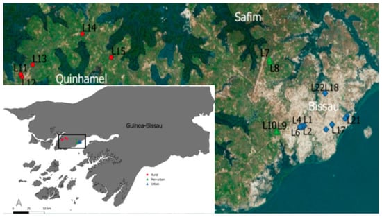 Location of the sampling points in Bissau and Quinhámel: urban (L1, L2, L3, L4, L5, L6, L16, L17, L18, L19, L20, L21, L22), peri-urban (L7, L8, L9, L10) and rural (L11, L12, L13, L14, L15).